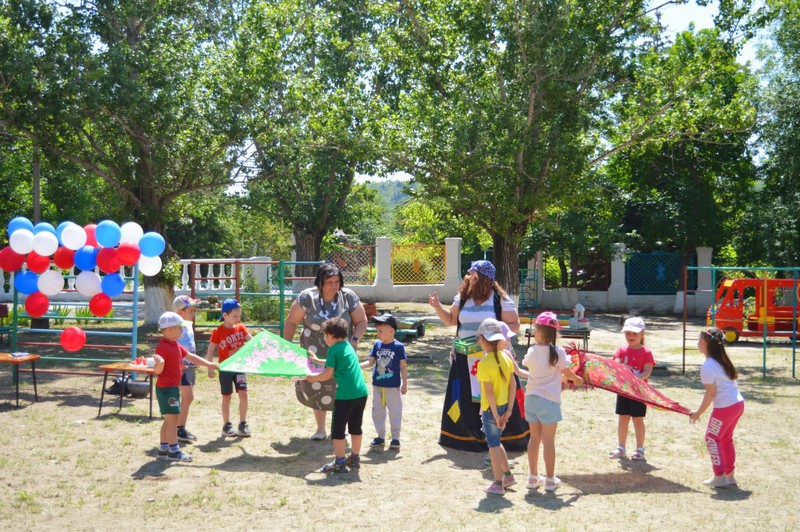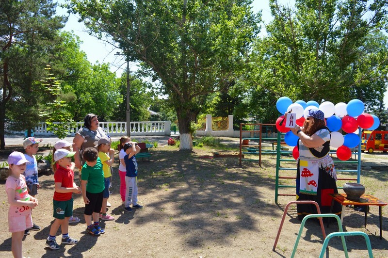 Дети играли в игры «Собери матрёшку», «Сапоги-скороходы», «Волшебный клубочек», «Ковёр-самолёт», а когда нашли потерянный флаг у разбойника, в завершении с огромным удовольствием все исполнили торжественный и патриотичный флешмоб «Вперёд, Россия!»