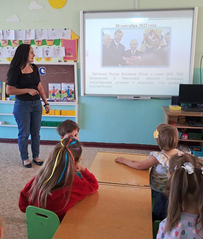 30 сентября мы отмечаем новый для нашей страны праздник – День воссоединения Донбасса и Новороссии с Россией, праздник свободы, гражданского мира и доброго согласия всех людей на основе закона и справедливости. Ребята приняли участие в патриотической акци " Одна страна. Одна семья. Одна Россия!", педагоги провели с дошкольниками тематические беседы «Выбор Донбасса». Знаменательная дата стала новой значимой датой для всех маленьких граждан Российской Федерации - воспитанников Быстрогорского детского сада "Колобок". Мы гордимся своей историей и стремимся к тому, чтобы жить в прекрасной и процветающей стране!