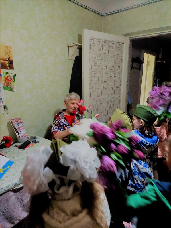 Воспитанники подготовительной группы «Ягодки» и старшей группы «Радуга» вместе с воспитателями посетили тружеников тыла Великой Отечественной войны, ребята вручили поздравительные открытки, цветы и пожелали им крепкого здоровья, оптимизма, бодрости духа.